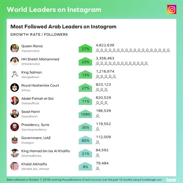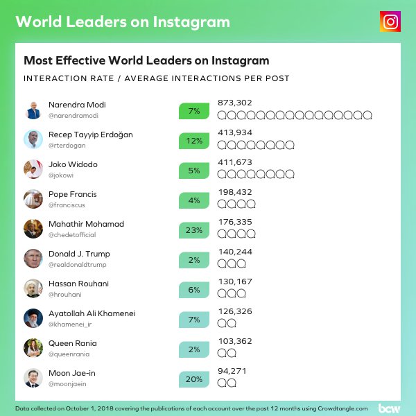 כיום יש ל-120 מנהיגים חשבונות אינסטגרם, כשני שלישים מכלל המדינות החברות באו"ם, אם כי לשניים מהחשובים במנהיגים - נשיאי סין ורוסיה - אין חשבון אישי. המנהיג עם החשבון הפופולרי ביותר הוא נרנדרה מודי מהודו עם יותר מ-14 מיליון עוקביםpic.twitter.com/Y8X8DBothH