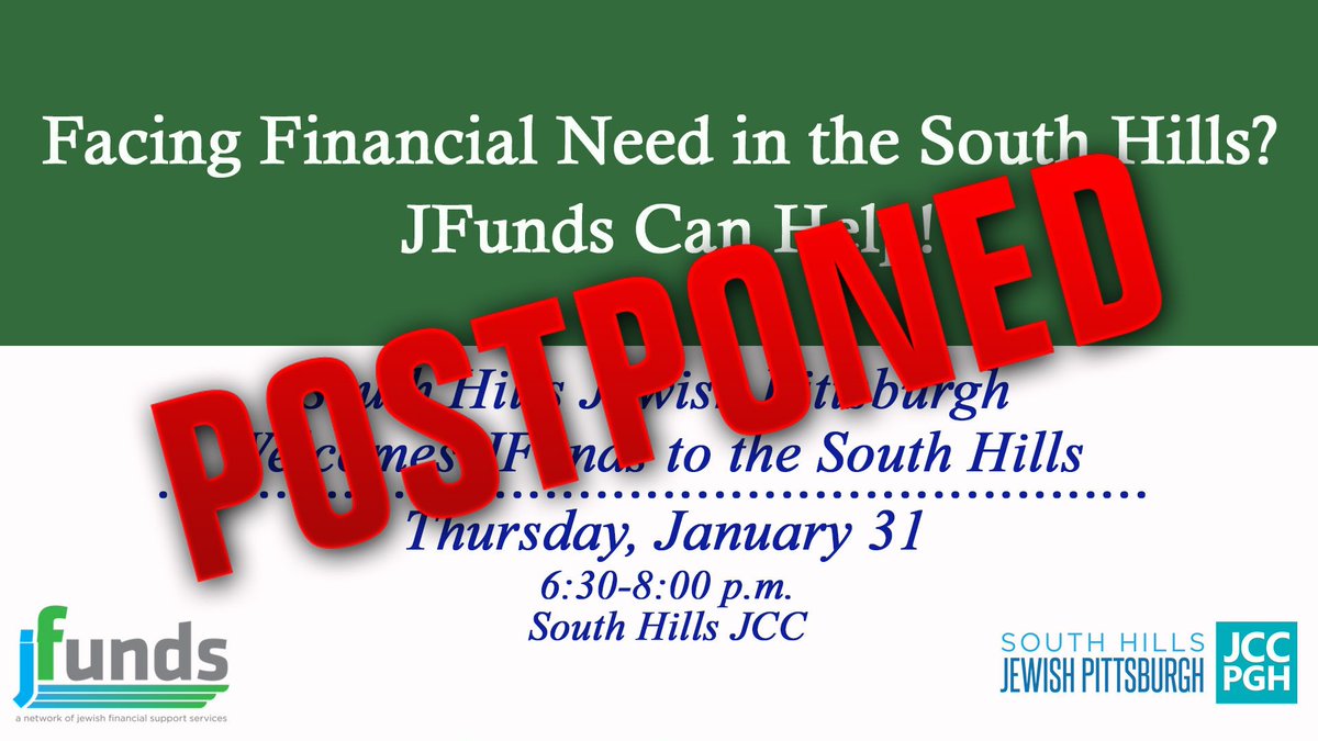 Tonight’s JFunds event at the JCC Pittsburgh - South Hills has been POSTPONED. A rescheduled date will be announced soon. If you have an immediate need, please contact JFunds Pittsburgh. Stay Warm!