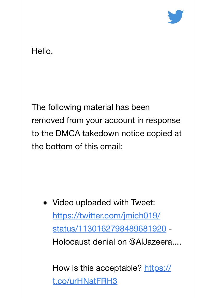 @AlJazeera’s video that gave air time to Holocaust denial. This followed the network’s request to@Twitter to have the video taken down.@Twitter found it fitting to remove the post. If you help to shelter antisemitism, you are part of the problem. Unacceptable.pic.twitter.com/creOdTIioq