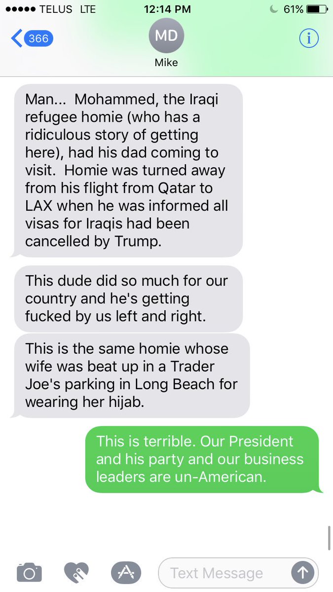 My friend Mike just sent this heartbreaking text about his refugee friend. Families are being torn apart. Shame on us. This is un-American.pic.twitter.com/eefHr9yo5v