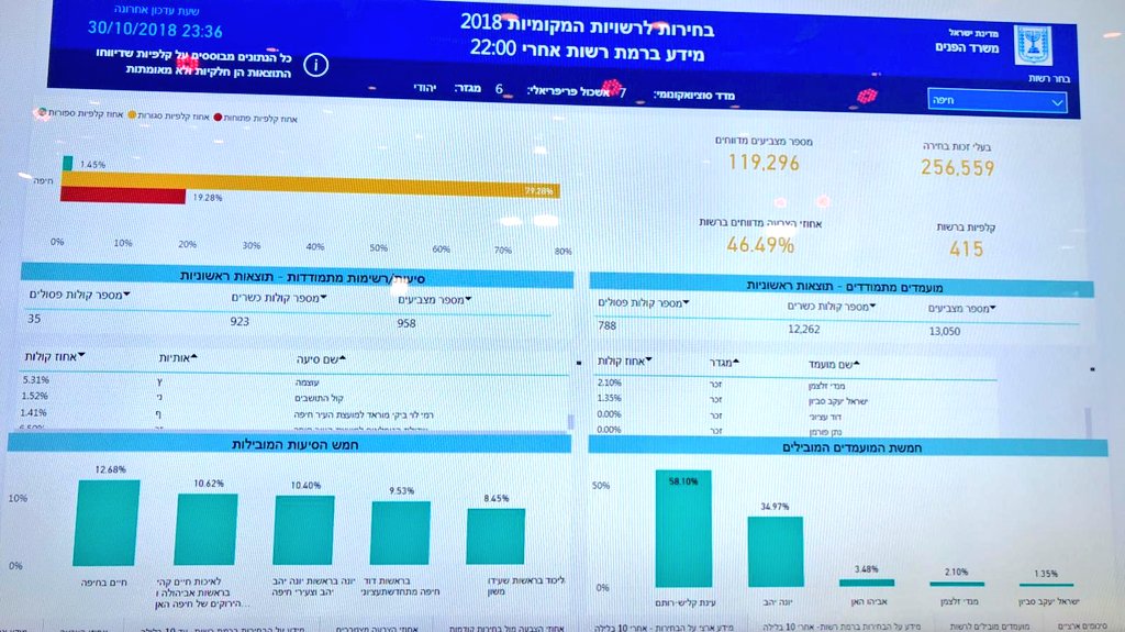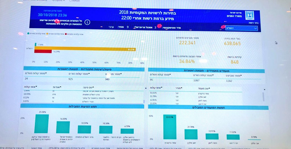 תוצאות ראשוניות בתל אביב: לפי ספירת 27 אלף קולות, רון חולדאי מוביל עם 41.35 אחוז ואחריו אסף זמיר עם 35.91 אחוז, אסף הראל עם 14.4 אחוזpic.twitter.com/bOotv6nrkj