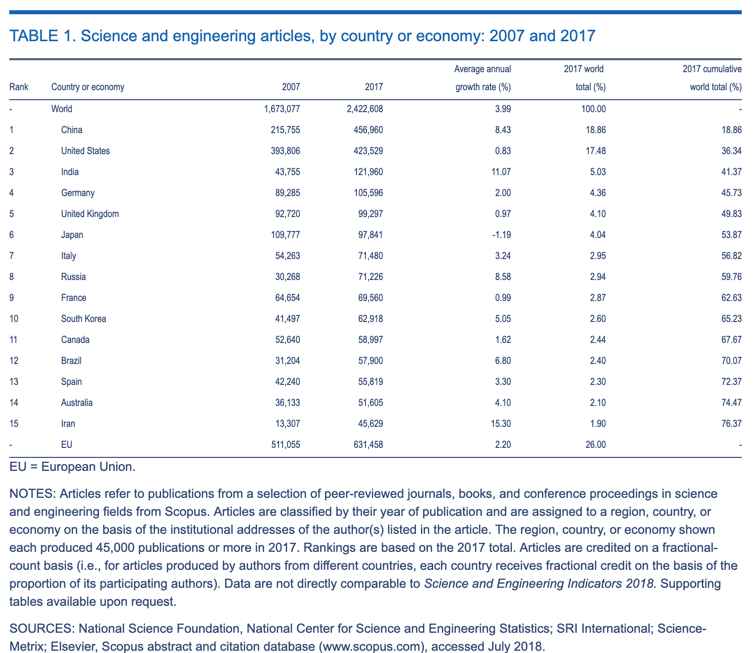 New Data From : “Science and Engineering Publication Output Trends: 2017 Shows U.S. Output Level Slightly Below That of China but the United States Maintains Lead with Highly Cited Publications”