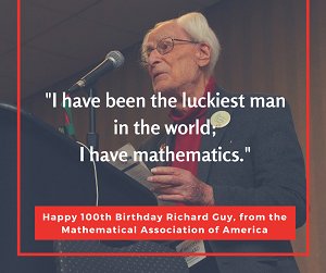 #8 forMAA Top 10 Math Moments of 2016: Renowned mathematician and MAA member Richard Guy turned 100! https://goo.gl/8H66Yz pic.twitter.com/OnaPd6uvXN