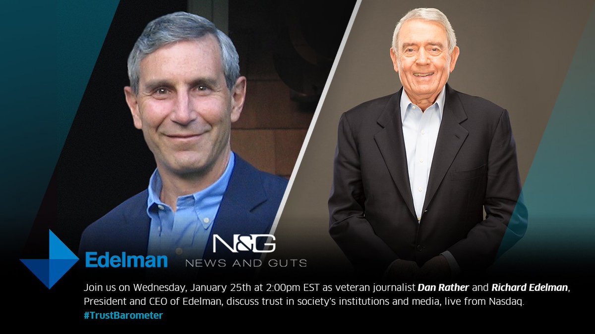 Tomorrow at 2pm, Dan Rather and Richard Edelman discuss the state of trust with Nasdaq's CMO Jeremy Skule: http://ow.ly/a7Sk308jm36 pic.twitter.com/nvDPEO3AAy
