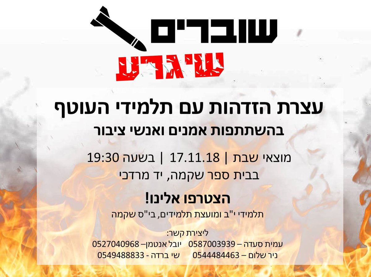 מובילי מחאת בני הנוער של עוטף עזה ישביתו מחר את הלימודים בבית הספר האזורי שער הנגב וכן נרתמו לעניין גם בני נוער מאזור אשכול. בהודעה שפרסמו אמש כתבו: "לאחר יממה של ירי טילים, אזעקות ללא קץ, הרוגים ופצועים אנחנו לא מוכנים להשאר אדישים למצב". ההפגנה מחר ב 9 בבית הספר שער הנגב