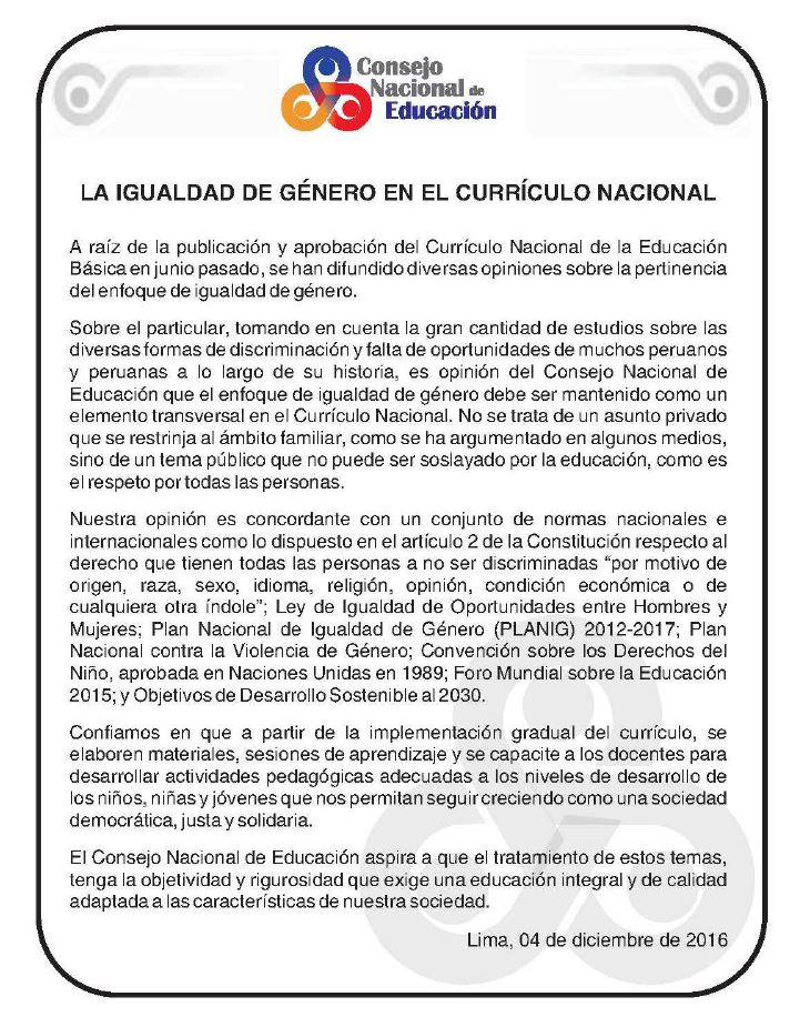 #PromovamosIgualdad Instituciones internacionales y nacionales respaldan el enfoque de igualdad de género del Currículo Nacional.pic.twitter.com/azXZQRhwUA
