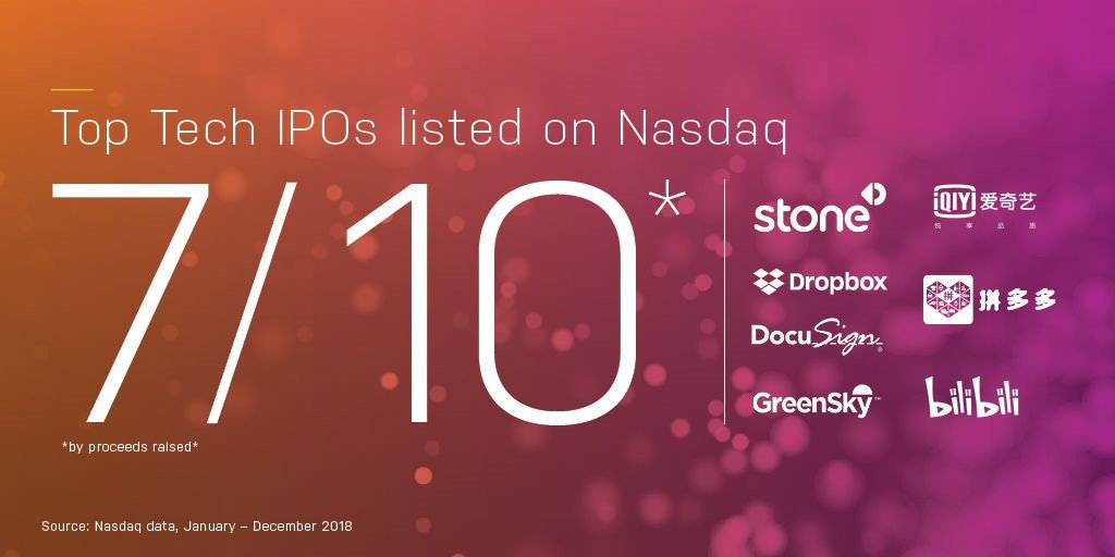 #IPOs by proceeds raised chose to list on Nasdaq, including@iqiyi Pinduduo, StoneCo Ltd,@Dropbox and@DocuSign