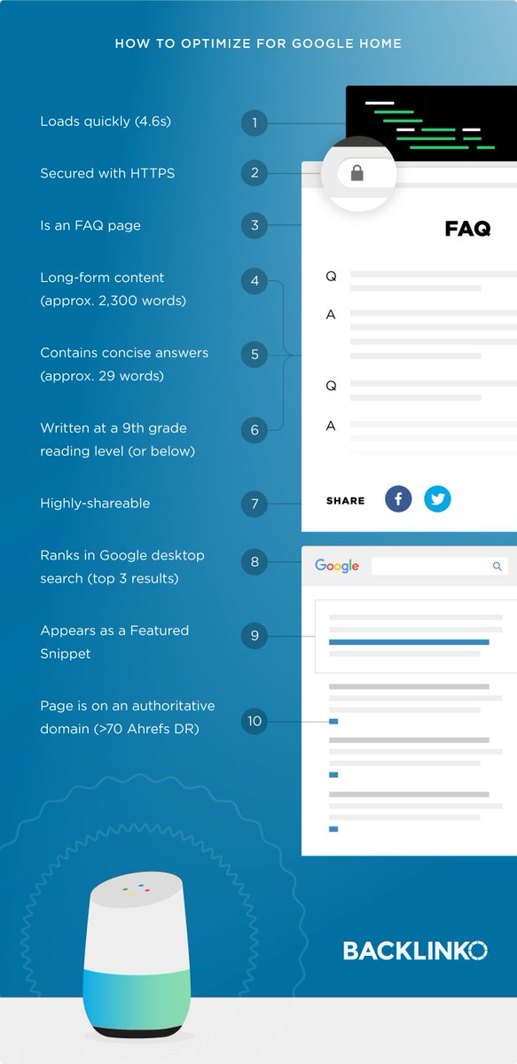 @Backlinko • 40.7% of all answers came from a Featured Snippet • The average result is written at a 9th grade level • Surprisingly high correlation to social shares More: https://backlinko.com/voice-search-seo-study …pic.twitter.com/NQkioRFAGC