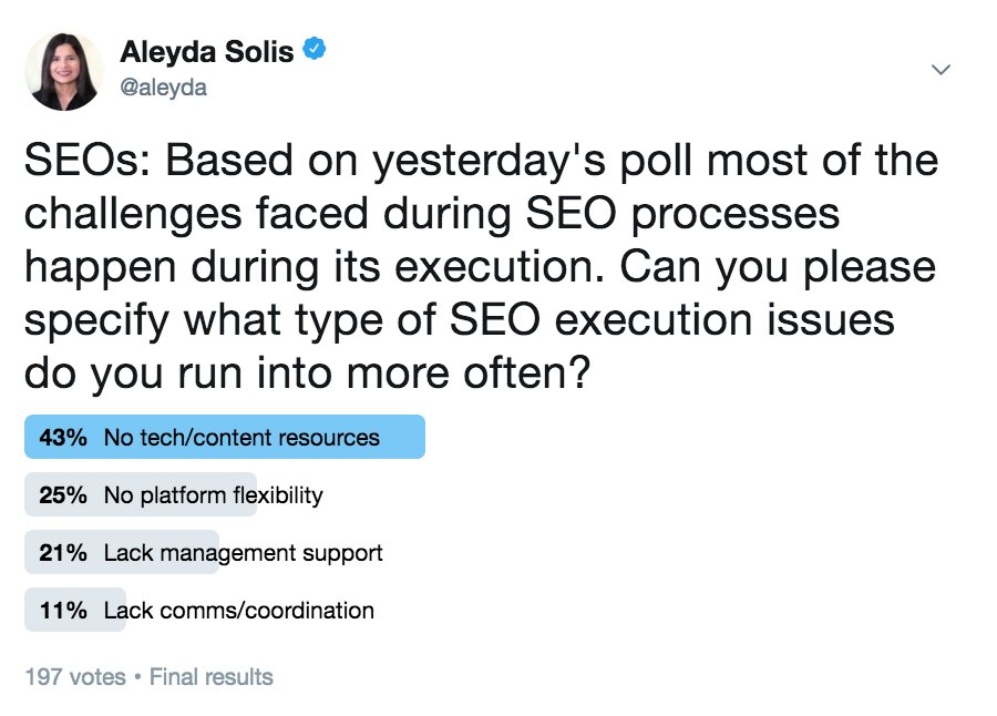 Results from the poll I did last week regarding most common SEO execution issues, the "no tech/content resources" is the winner