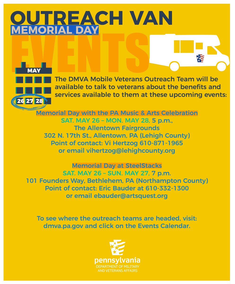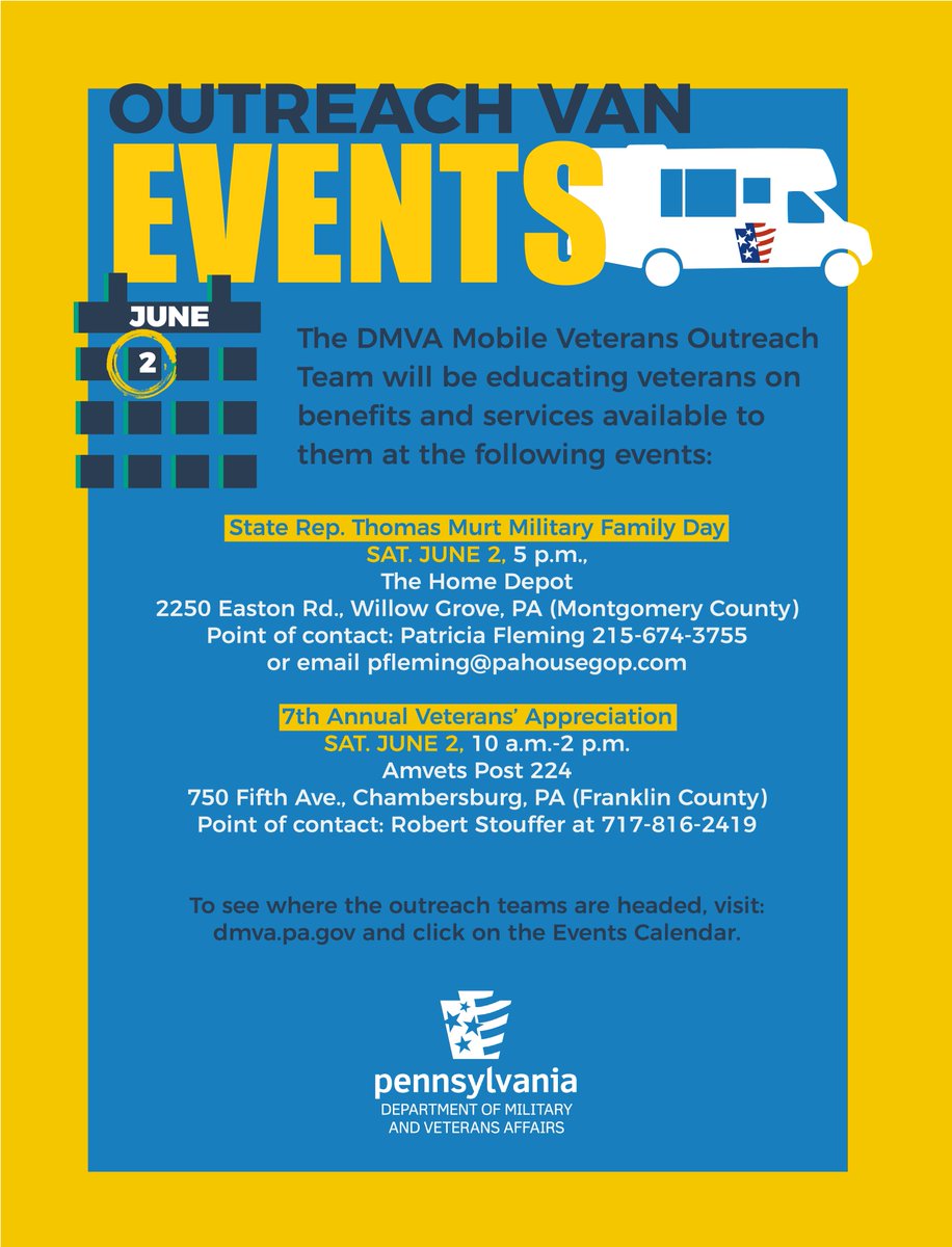 @PADMVA certified Veterans Outreach Team will be at the events listed below this weekend. If you can’t make either event, go to http://dmva.pa.gov and click on the EVENTS CALENDAR to find a date, time and place that works for you!pic.twitter.com/xrhztZSBqv