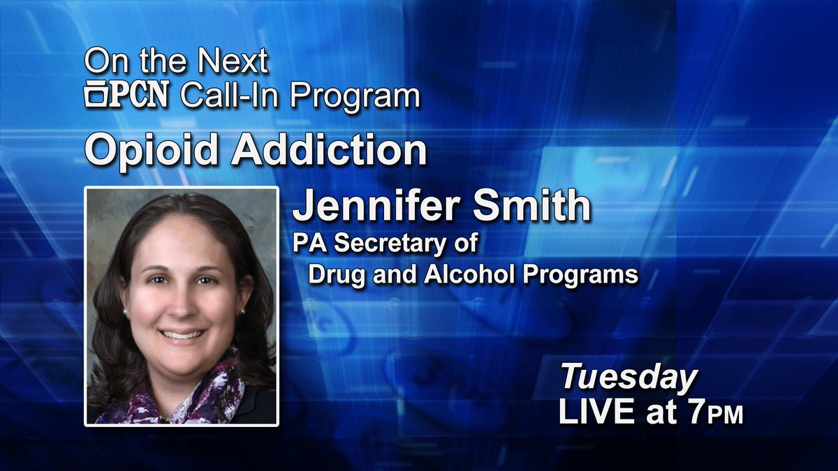 15 minutes until we are LIVE with Secretary Jennifer Smith of @PADrugAlcohol discussing Opioid Addiction. Call 1-877-PA6-5001 or tweet us here! Watch LIVE on PCN and PCN Select.#CallInonPCNpic.twitter.com/ypeCC23mAM