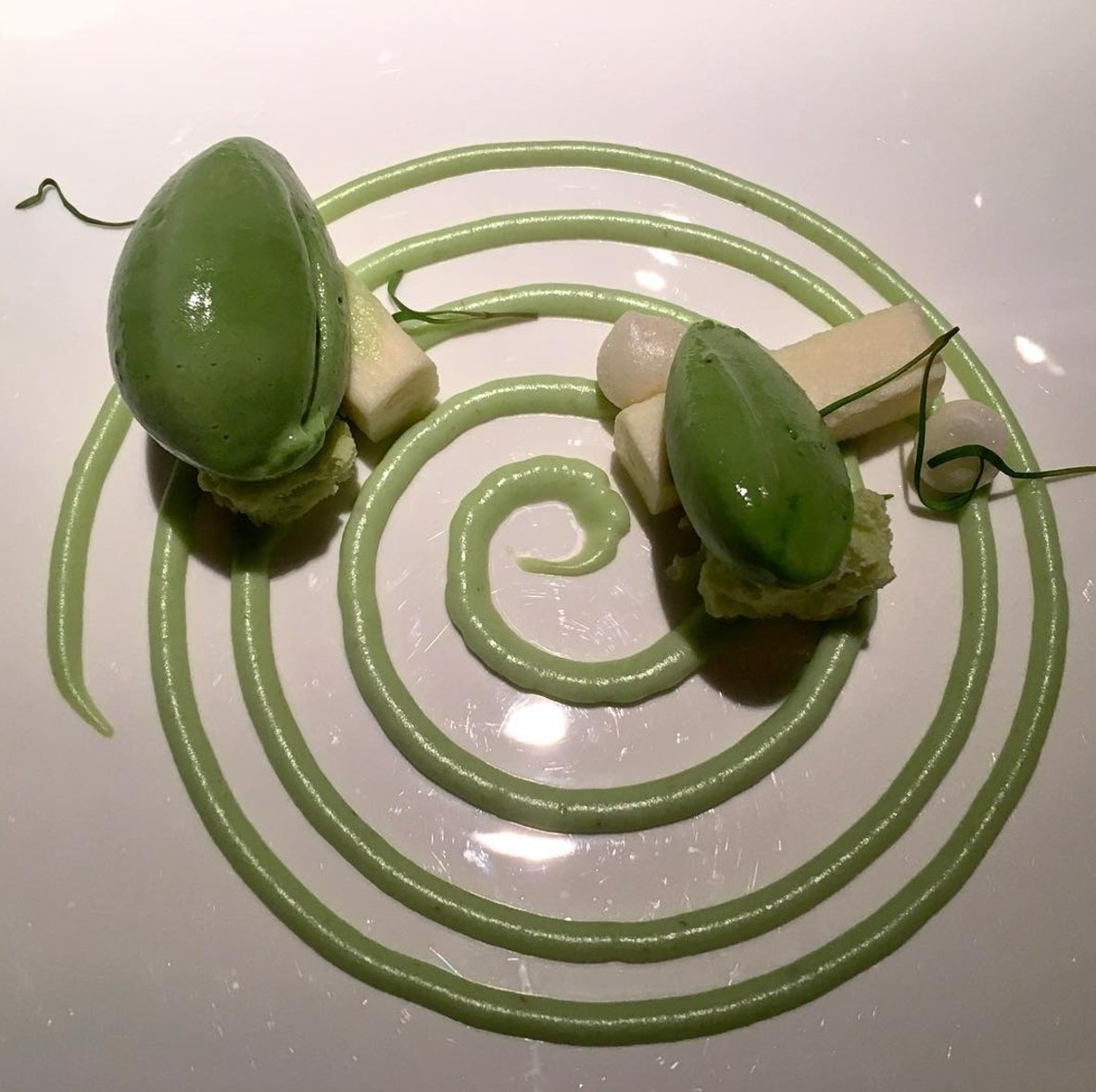 🍴 'Yuzu, manzana y chocolate blanco' Toño Pérez (Atrio, Cáceres, 2 estrellas Michelin) viste de verde a este plato dulce, frutal y cítrico