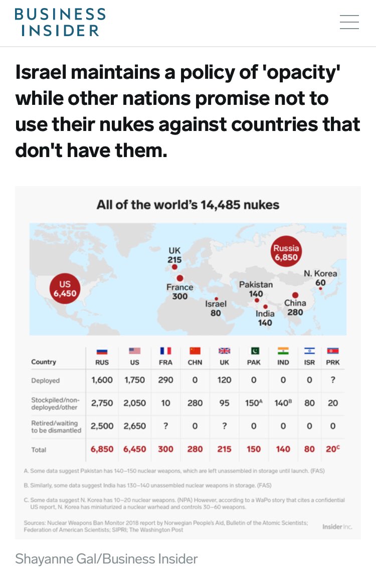 ישראל משמרת את ״מדיניות העמימות״ שלה. הערכה הרווחת שבידי ישראל יש לפחות 80 ראשי קרב גרעיניים. למרות שהערכה מלומדת על יכולת הפקת הפלוטוניום של הכור בדימונה, הנה בכמות המספיקה ל 100-200 ראשי קרב גרעיניים. https://www.businessinsider.com/these-are-the-9-countries-with-nuclear-weapons-2018-10 …pic.twitter.com/n8UZdBheUa