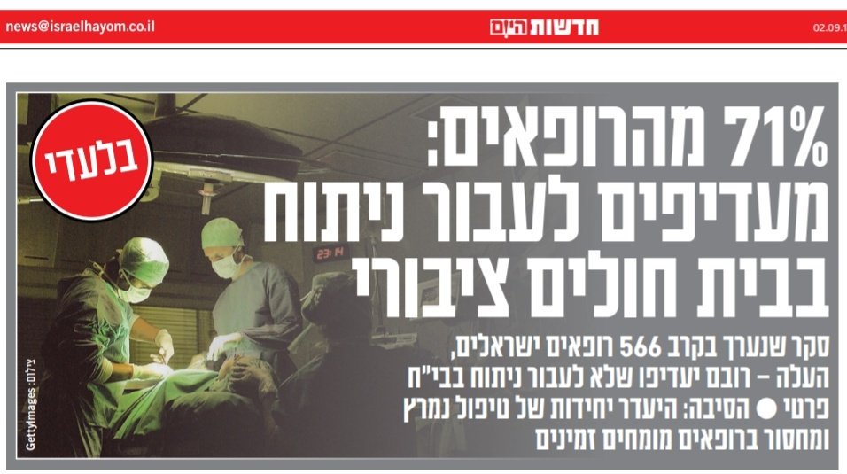 #רופאים, ובהתבסס על ניסיונם האישי, השיבו 71% שהיו מעדיפים לעבור ניתוח ב-#ביתחולים#ציבורי. הסיבה: מחסור ביחידות לטיפול נמרץ ובצוות מלא וזמין של רופאים מומחים בבתי חולים פרטיים.הפרטים המלאים בידיעה של כתבנו@ranreznik https://www.israelhayom.co.il/article/583981 pic.twitter.com/vIEEI1z8Cj