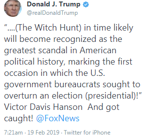 Trump's latest rage tweets about the Mueller investigation were lifted directly from Fox News. He apparently recorded last night's programming and watched it during today's Executive Time.https://twitter.com/MattGertz/status/1097846509285052416 …