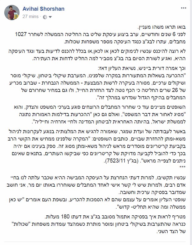 בעסקת שליט, כשהונחה לפתחו של בג"צ, עתירה של משפחות שכולות כנגד העיסקה, דחה הרכב השופטים את העתירה בטענה שאל לבג"צ להתערב ושהממשלה היא זו שממונה להכריע בתחום הביטחון. הפסיקה אתמול מראה שההתערבות בשיקולי ביטחון ומוסר מותרת כשמהצד עומדות משפחות "שכולות" של הצד השני. אוי לבושהpic.twitter.com/4r7scGSY57