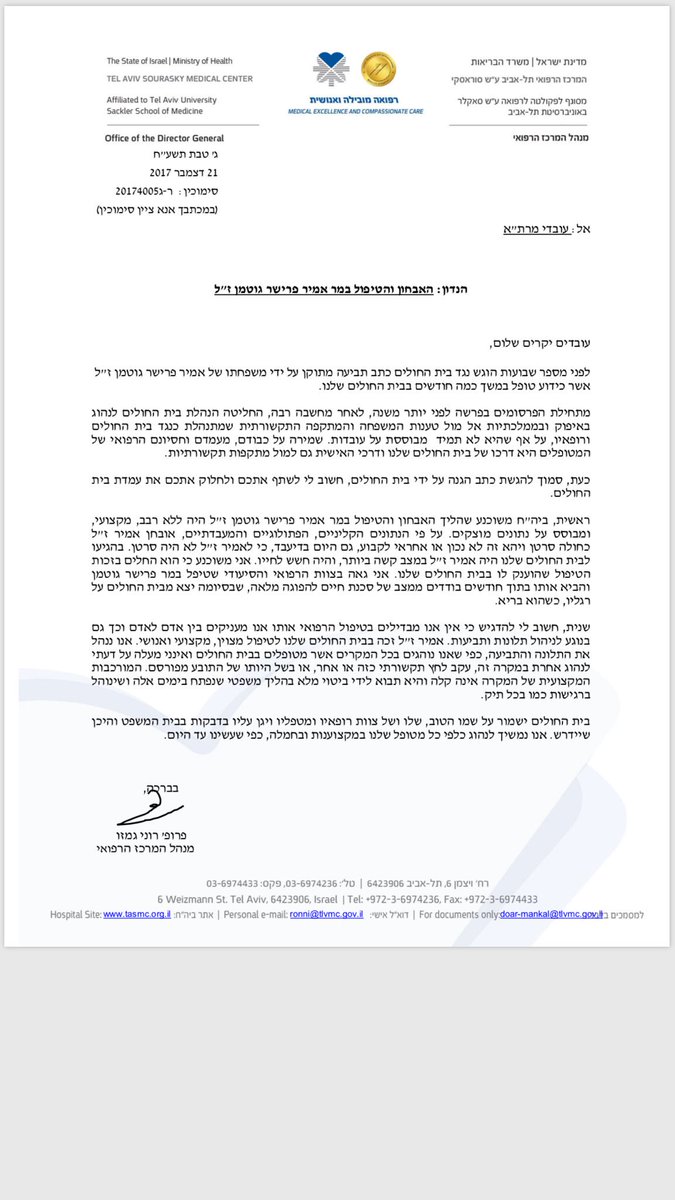 מנכ״ל איכילוב פרופ רוני גמזו במכתב לעובדים: ״לאמיר פרישר גוטמן היה סרטן״pic.twitter.com/tXb9DCJG6Q