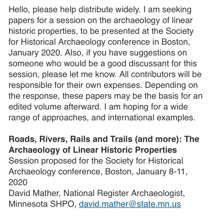 Call for papers on the archaeology of linear historic properties, for the 2020 Society for Historical Archaeology conference. Please forward.