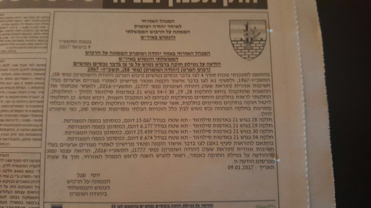 מתווה עמונה מתקדם - לדברי הפלסטינים היום הועברה להם הודעה על נטילת חזקה של קמ"ט אפוטרופוס על הרכוש הנטוש במנהל האזרחי בחלקים היחסיים >>>