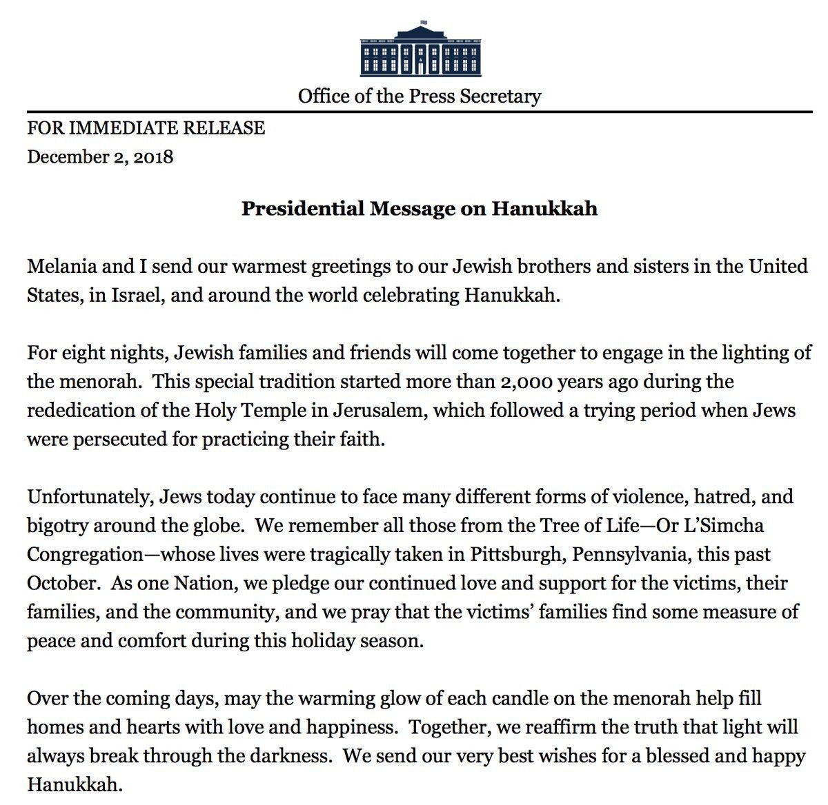 נשיא ארה"ב דונלד טראמפ מברך את העם היהודי בברכת "חג חנוכה שמח". בהודעה רשמית מטעם הבית הלבן שלח הנשיא בשמו ובשם רעייתו מלניה: "איחולים חמים לאחינו ואחיותינו היהודים בארה"ב, בישראל ובכל העולם. מי ייתן ואורו המחמם של כל נר ימלא את הבתים והלבבות באהבה ובשמחה".