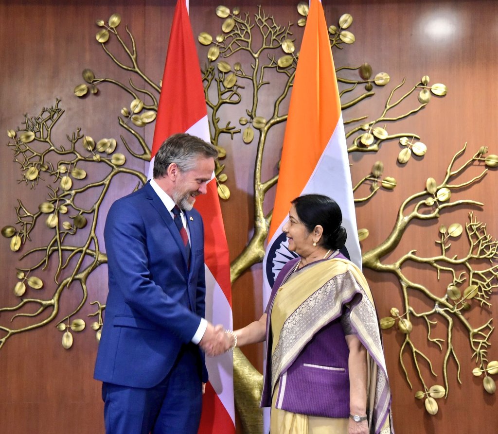 @SushmaSwaraj greets Denmark Foreign Minister@anderssamuelsen ahead of 2nd Joint Commission Meeting#JCM, convened after a gap of 8 years. Relations are poised to take off in a comprehensive manner given the synergies across sectors.pic.twitter.com/yy5N2KJIvA