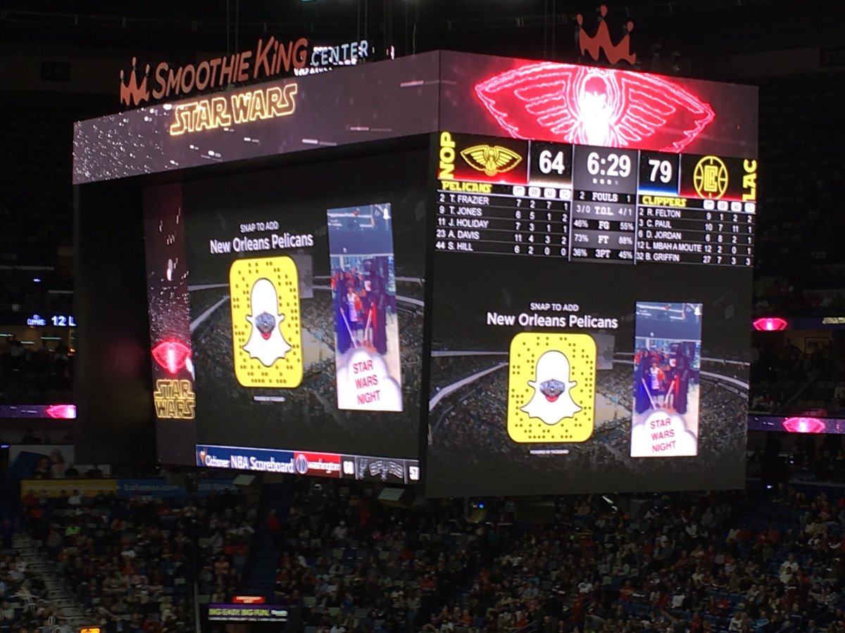 @snapchat being shown on the video board at the Smoothie King Center via@tagboardpic.twitter.com/M2bJxYz5pI