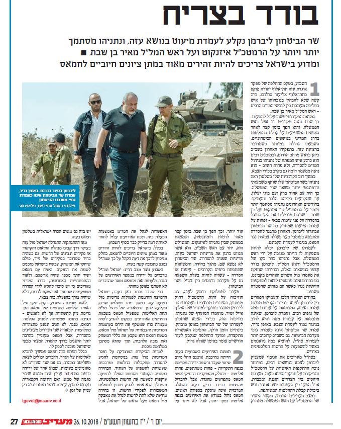 מה שבין שר הביטחון למערכת הביטחון. מעמדו המתחזק של ראש המל"ל, מאיר בן שבת ומדוע צריכים להיות זהירים במתן ציונים חיוביים לחמאס על ירידה מוגבלת בנפח האלימות על הגדר, שעדיין אינה משקפת מגמה. טור שישי: