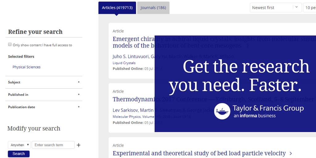 Searching on http://tandfonline.com for research in a Taylor & Francis or Routledge journals? Narrow down those results by subject area, journal title or date. Only want to see the research you have access to? Select ‘only show content I have full access to’.