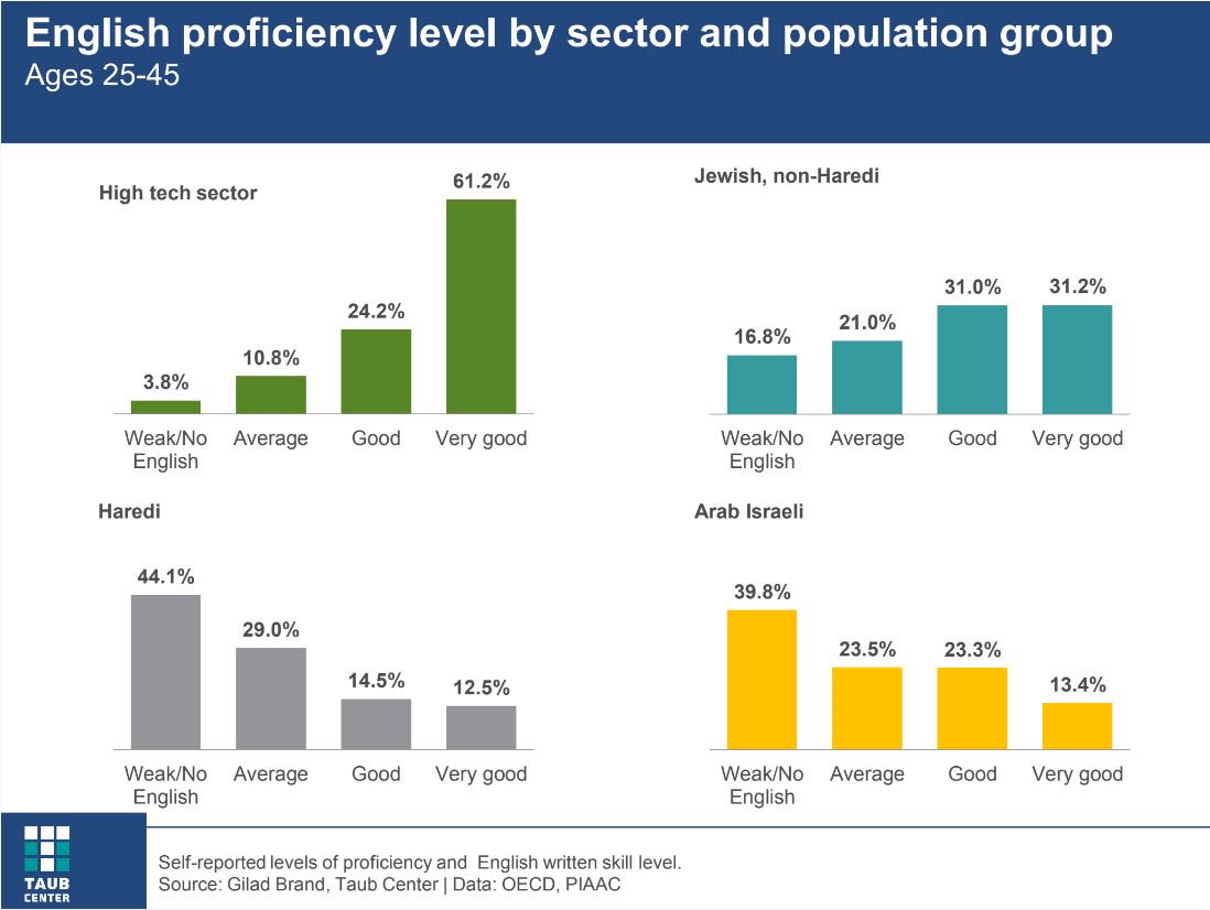 New Taub Center research finds that one of the most important skills for employment in high-tech is English language proficiency. Workers who lack knowledge of English are unlikely to be employed in the high-tech sector, regardless of their other skills…pic.twitter.com/YcjswMRXI5