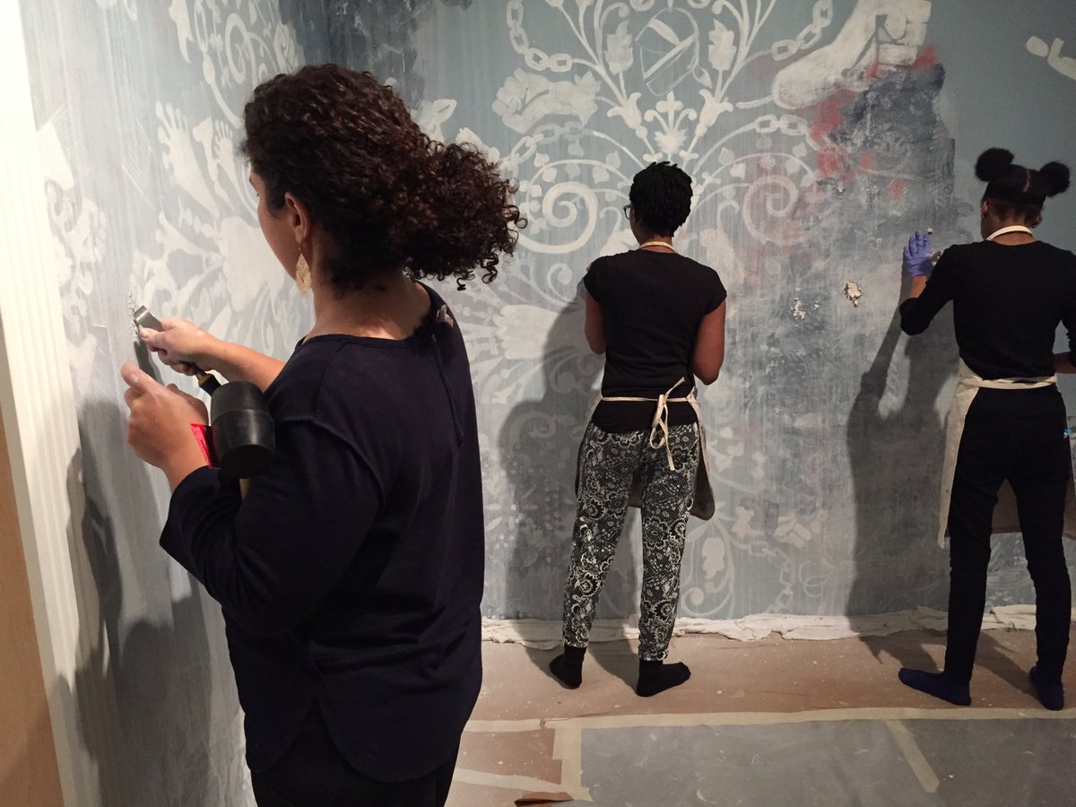 The end of the mural installation for “Firelei Báez: Bloodlines" included distressing the work w/ chains & tools.