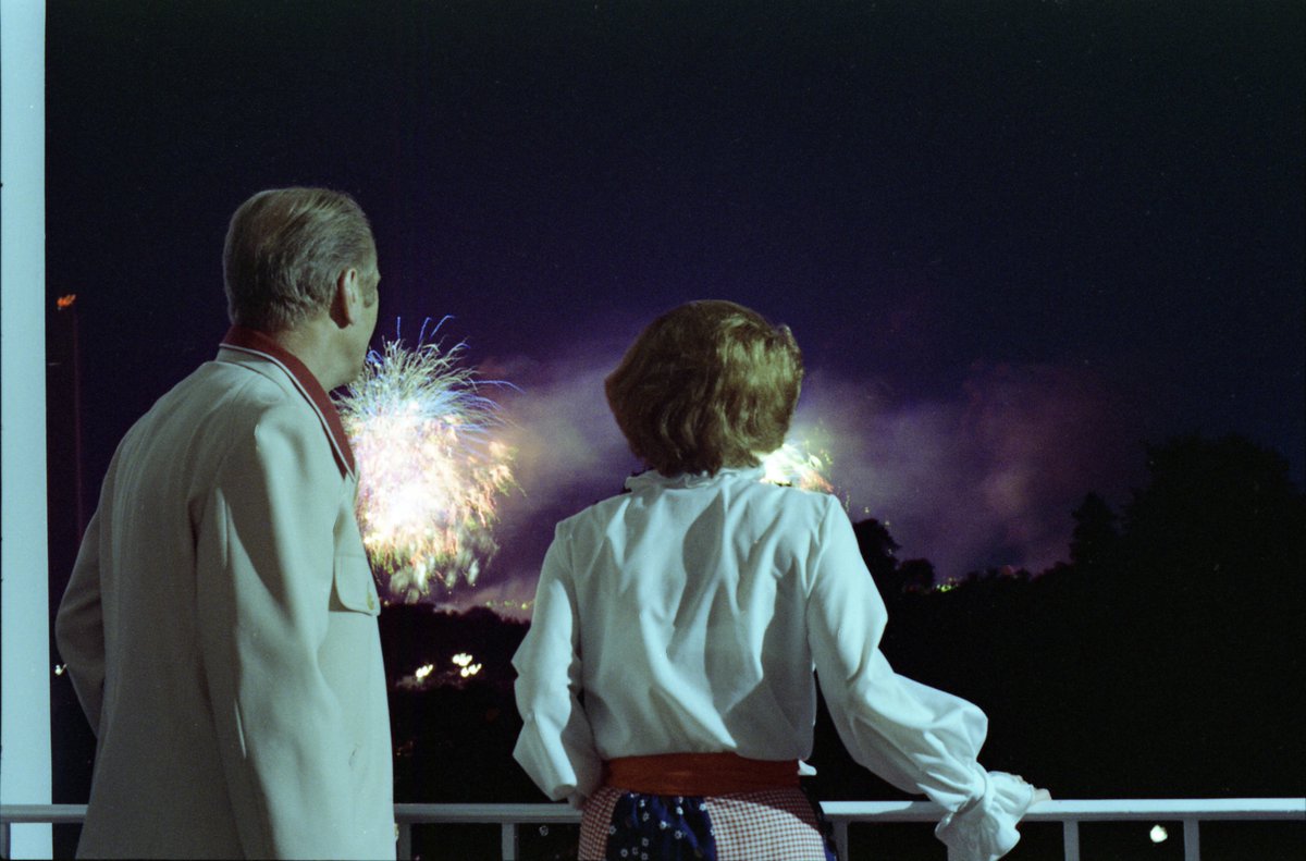 President and Mrs. Ford watching the National Fireworks Display from the Truman Balcony at the White House on America’s Bicentennial, 7/4/1976.