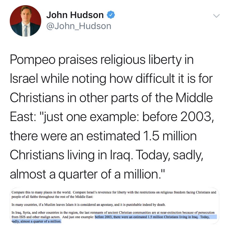 People are pointing out that the Iraq War happened in 2003 so how could Pompeo be so ridiculous but this is what Rs do. In this case: fight a war that leads to displacement & a decade later, point at displacement of Christians for how Muslim majority countries are intolerant.