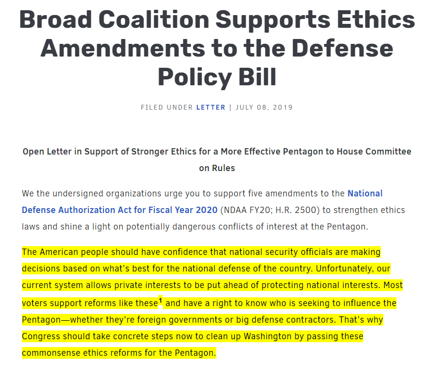 1/ NEW: POGO joins a bipartisan coalition calling for Congress to support amendments that strengthen ethics laws & shine a light on potentially dangerous conflicts of interest at the Pentagon: Here’s why...