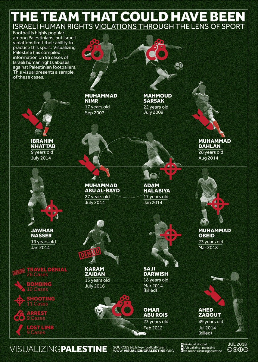 NEW VISUAL: As we watch the World Cup Final on Sunday, our thoughts will also be with the Palestinian footballers whose lives have been disrupted or ended by Israeli human rights abuses. http://bit.ly/vp-football-visual …pic.twitter.com/Jf4HMV7HwX