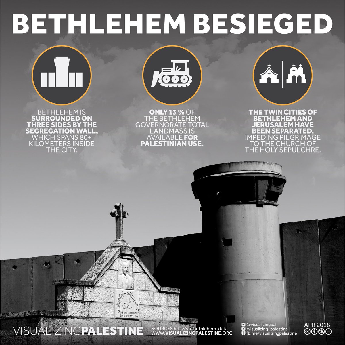 Identified in the New Testament as the birthplace of Jesus, Bethlehem today is surrounded by a landscape dotted with gun turrets and barbed wire. Full visual at: http://bit.ly/vp-bethlehem pic.twitter.com/ZBl9fFyrLv