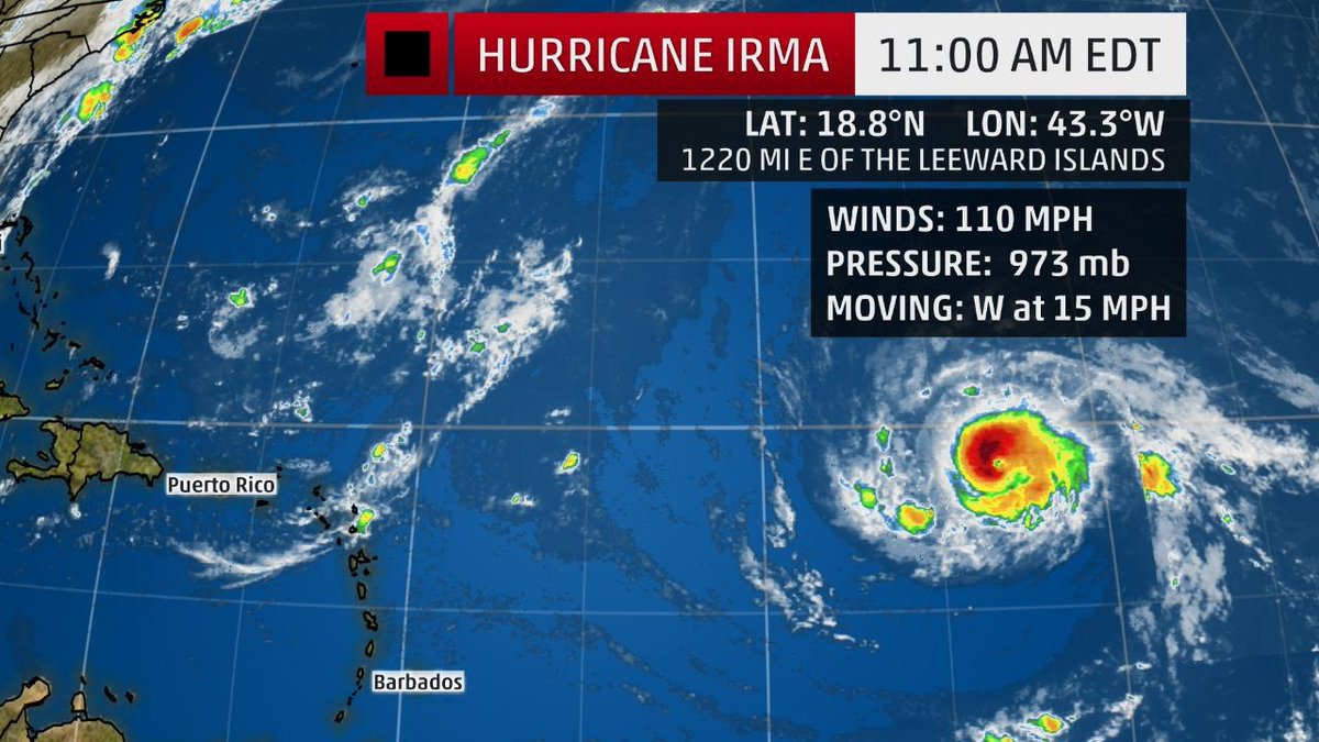 #Irma is a Category 2 hurricane and continues to track westward, possibly impacting the Leeward Islands next week: http://wxch.nl/2iPK8CX pic.twitter.com/XZZ00VIfxn
