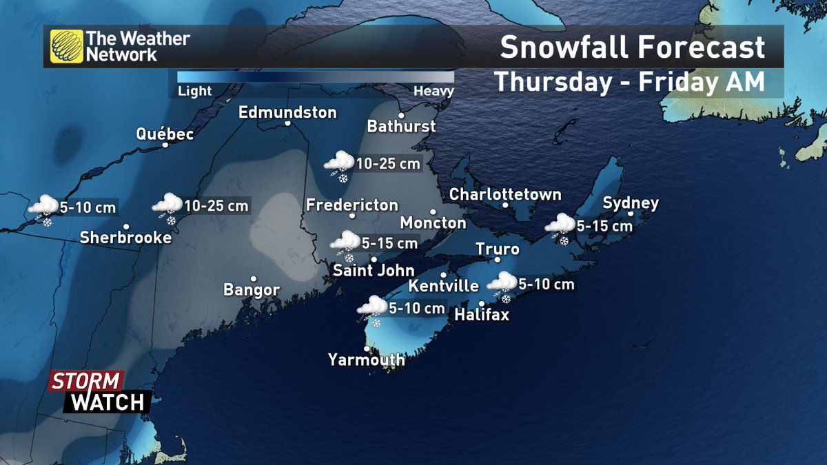 Keep in mind this is our snowfall forecast just for the first in a series of lows. Lower snowfall totals for NS because we'll see a transition to rain on Thursday from west to east
