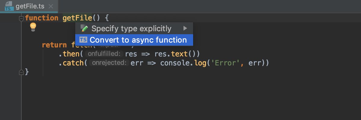 You can use TypeScript 3.1 and its new intention that converts Promises to async functions in .ts files in WebStorm 2018.2: - update the project's TypeScript version and - select TypeScript 3.1 in Preferences | Languages & Frameworks | TypeScript.pic.twitter.com/R2hX6lOfIe