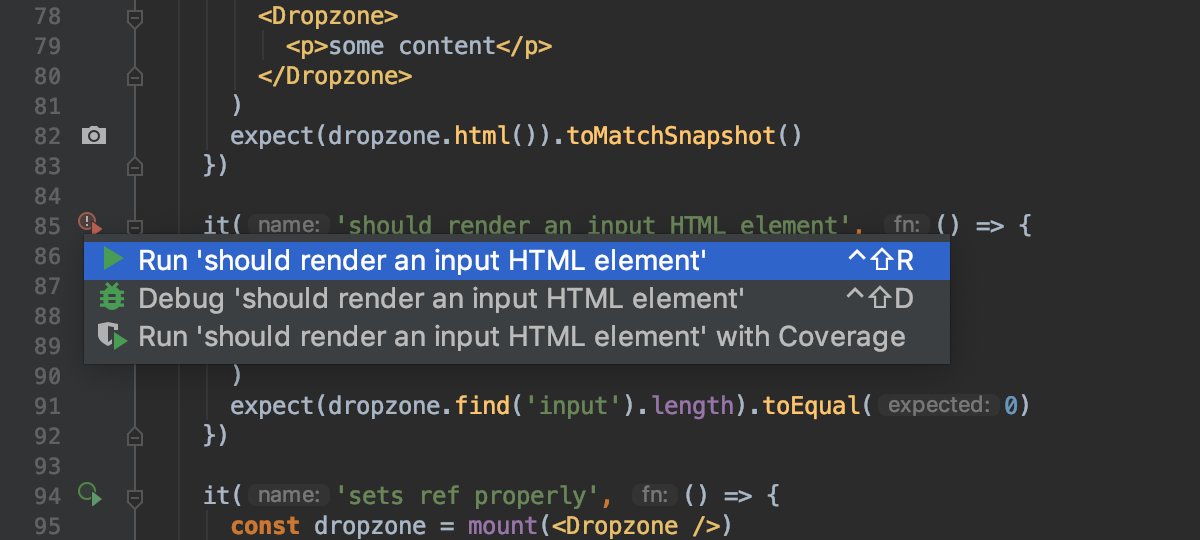 Want to run a single test? Click on the icon next to it in the editor and select Run. Or put the caret somewhere in the test and press Ctrl-Shift-R on macOS or Ctrl-Shift-F10 on Windows or Linux.