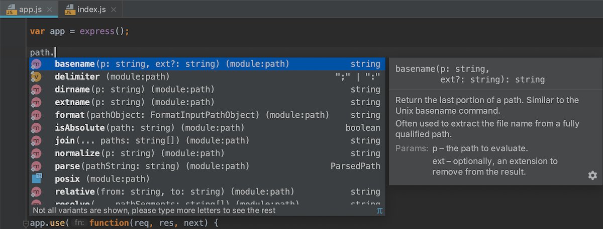 Docs for Node.js APIs are now more detailed and there's code completion for React lifecycle methods.