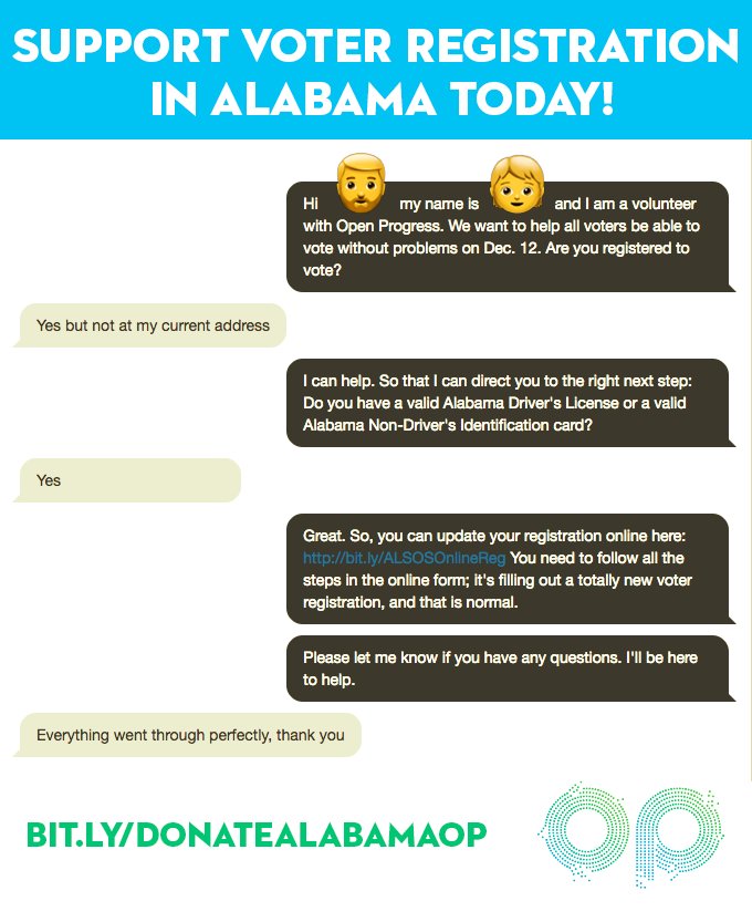 Open Progress is leading the charge in reaching nearly *200,000* voters in Alabama to make sure they can vote without issue on December 12, but we can't do it alone. Will you help us strengthen democracy?https://www.openprogress.com/contribute-alabama-17 …