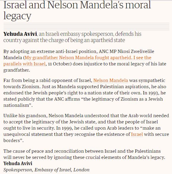 “Mandela stated publicly that the ANC affirms the legitimacy of Zionism as a Jewish nationalism”; an important reminder, perhaps especially relevant to