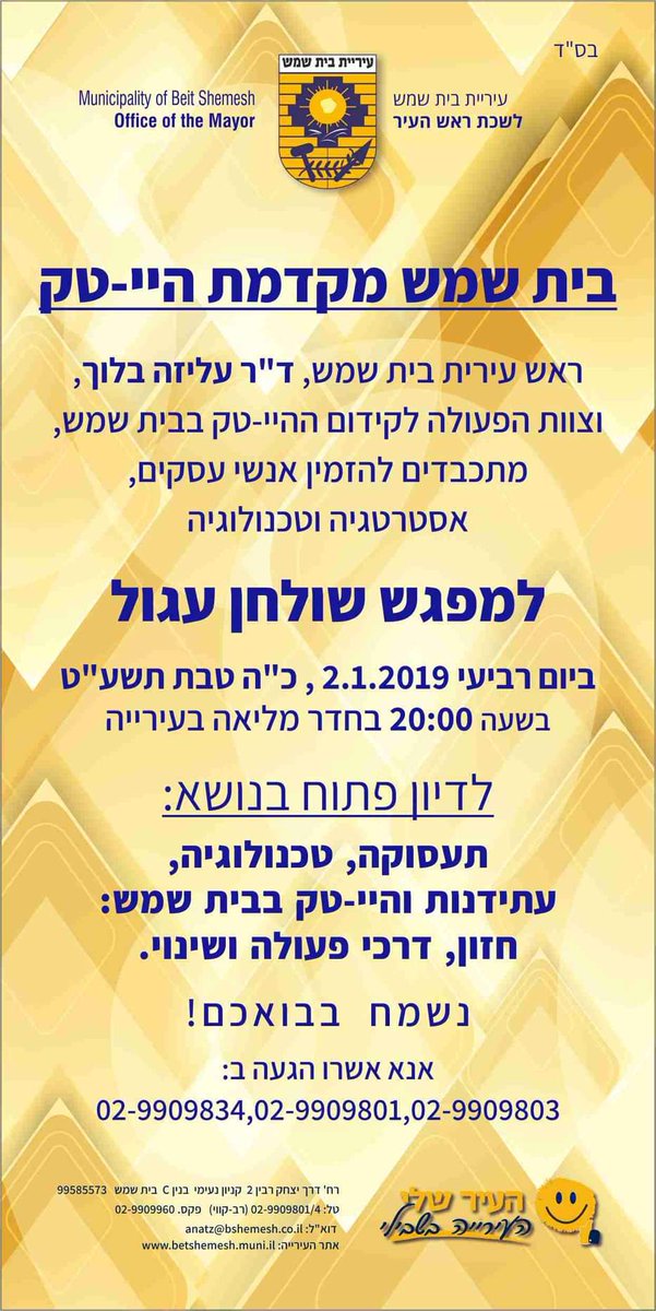 חברים וחברות יקרים, מוזמנים להיות חלק משולחן עגול בנושא הייטק בבית שמש. אני רואה נושא זה כאחד הנושאים המרכזיים בהם נשקיע בעירנו ואשמח שתהיו חלק. אתם אנשי הייטק? הירשמו כאן: https://goo.gl/forms/Xu8GyAgqQIp2fFA02 … מכירים אנשי הייטק- אנא תייגו אותם ושלחו אליהם. יחד הופכים את בית שמש לעיר העתיד!pic.twitter.com/Sg3Drcbk6j