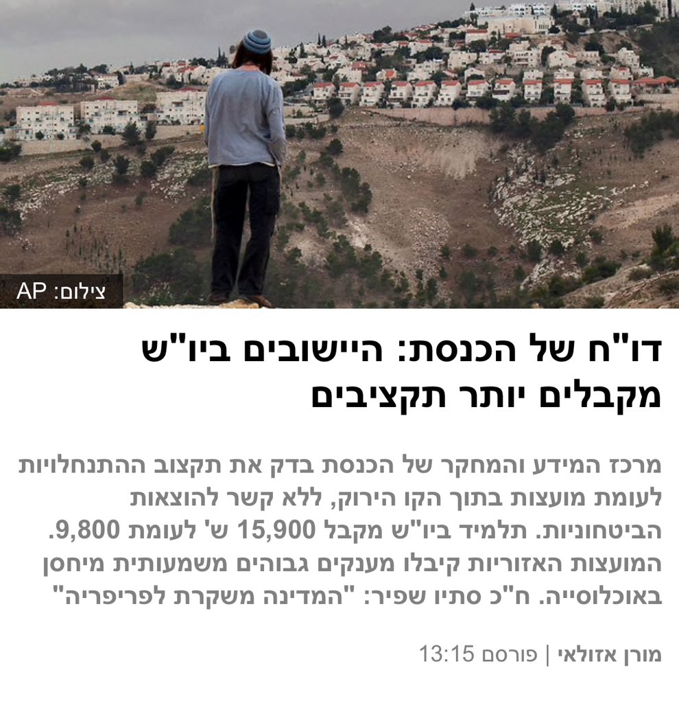 בהתנחלויות הכל בחינם, כן כפרות. הנה מתפרסם דו״ח של מרכז המידע של הכנסת שמתאר במספרים את סיפור ההזנחה של הפריפריה את האמת אי אפשר להסתיר, אנחנו מרגישים אותה יומיום: ממשלת