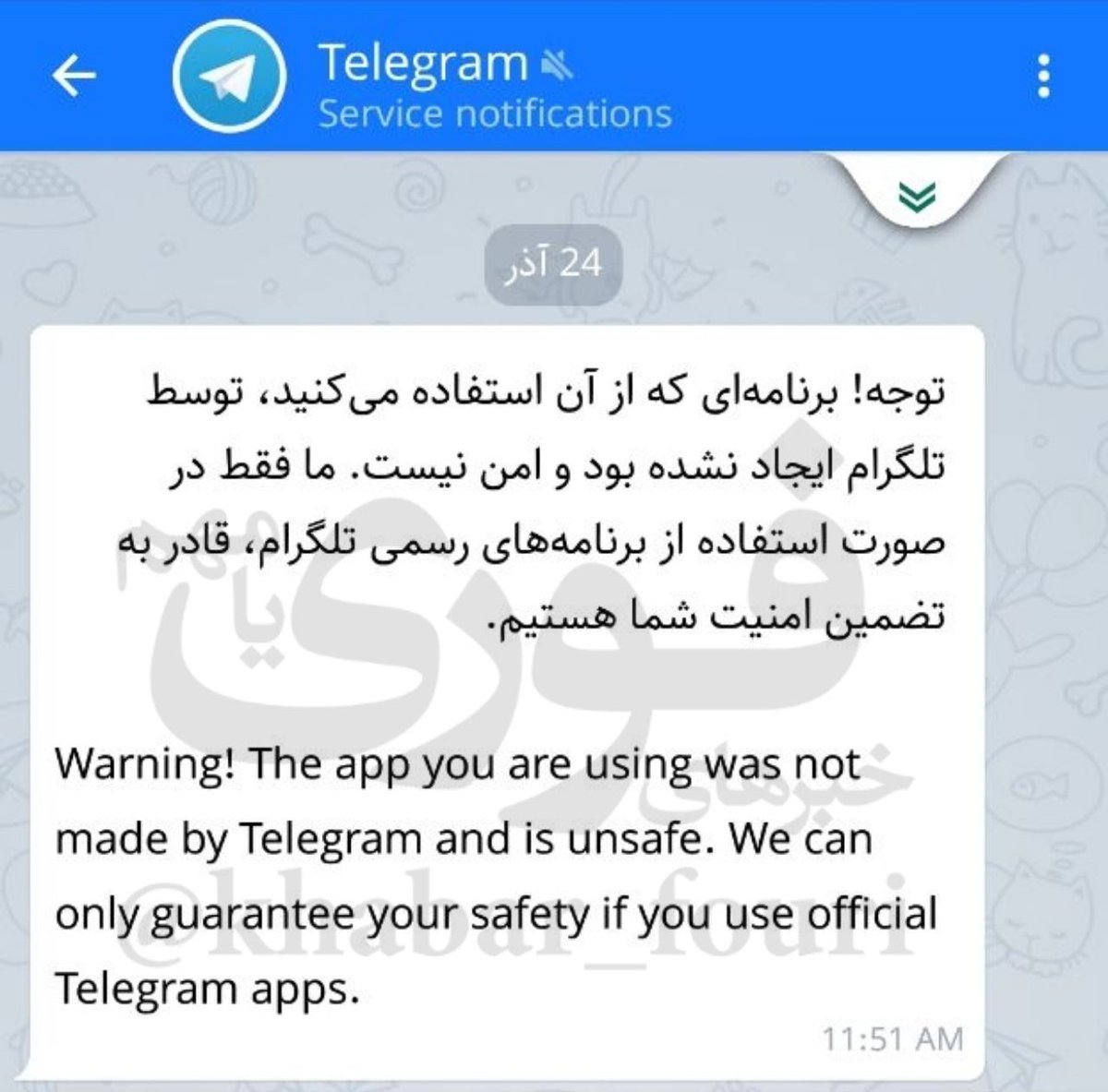 #Iran operating under the#Telegram company's name are "unsafe,"@telegram warns. The warning popped up today for users of#TelegramTalaeii and#Hotgramhttps://twitter.com/ICHRI/status/1073944138721185793 …