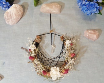 Moon wall hanging with crystals, dried flowers, silk flowers and dream catcher webbing on a vine wreath